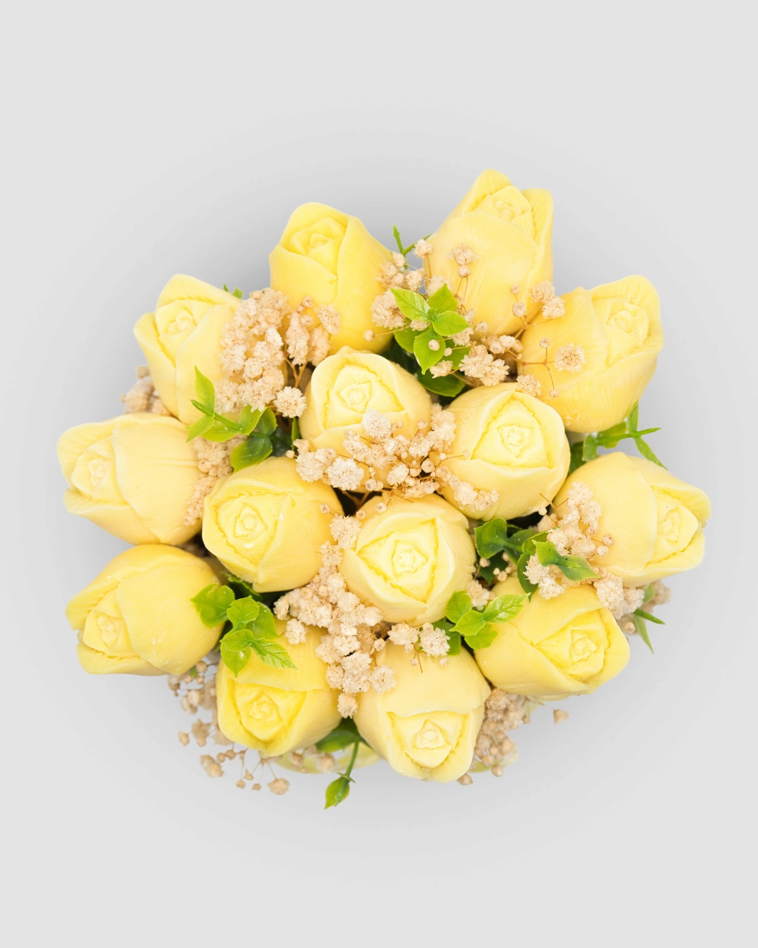 Οι ζωηρές κίτρινες τουλίπες χαρίζουν φως και ζεστασιά στον χώρο, ενώ το άρωμα πασχαλιάς προσθέτει μια ανοιξιάτικη, φρέσκια και ρομαντική νότα.
